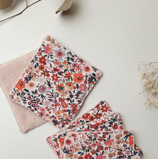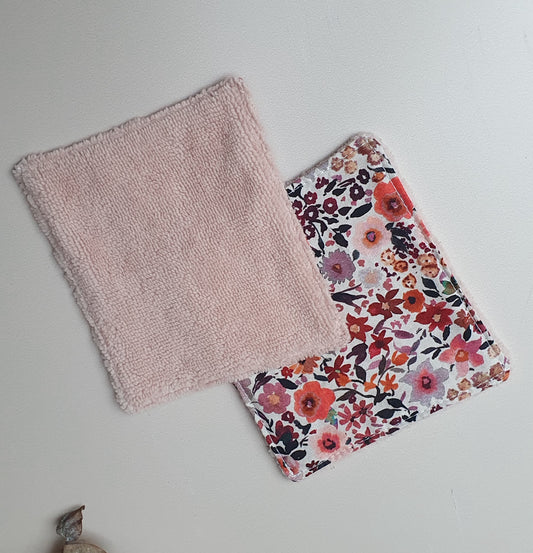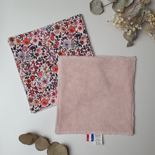 Inspiration – Lingette fleurie (11x10 cm) en coton & éponge bambou rose lavable