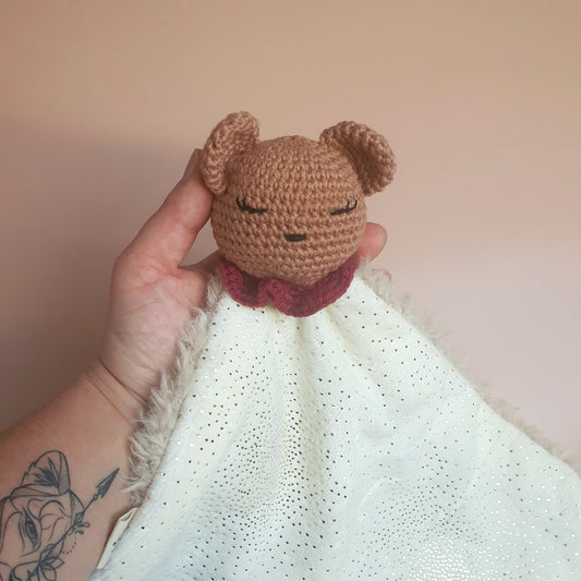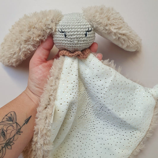 Un compagnon tendre avec une tête crochetée et des oreilles douces cousues, entièrement personnalisable. Fait main, il est parfait pour rassurer bébé.