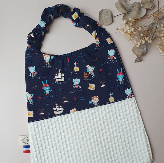 En stock – Bavoir maternelle élastique coton pirates bleu marine & nid d’abeille écru – Dos imperméable