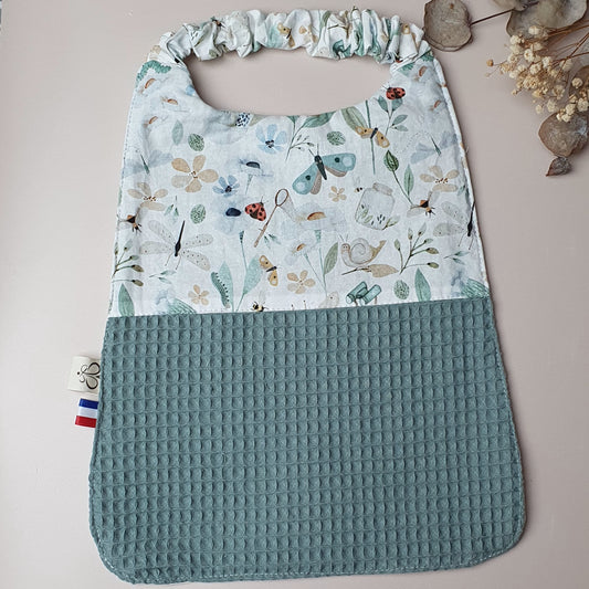 En stock – Bavoir maternelle élastique coton insectes & nid d’abeille vert sauge – Dos imperméable